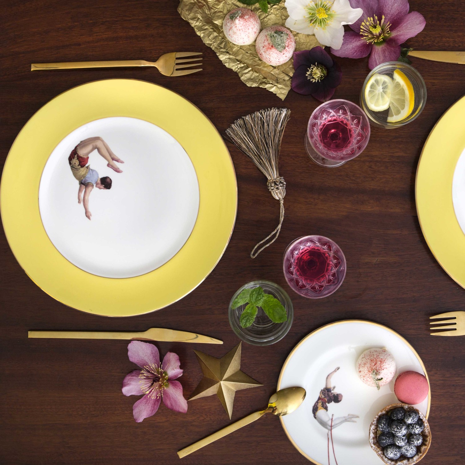 An exquisitely handcrafted fine bone china dinner plate with the circus-inspired Trapeze Boy design and bright yellow border.