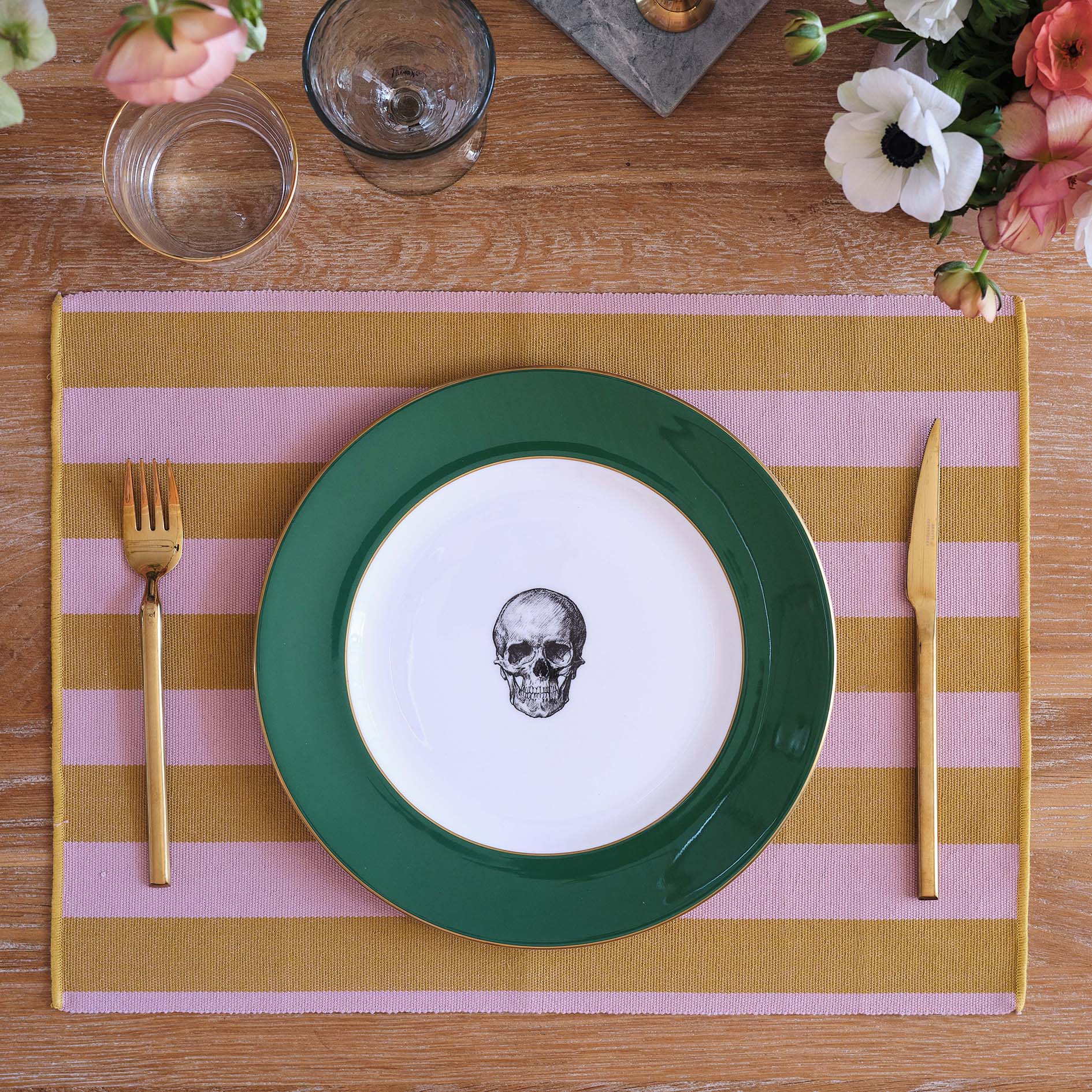 An exquisitely handcrafted bone china dinner plate with the Skull design paired with bold and beautiful Forest Green border.