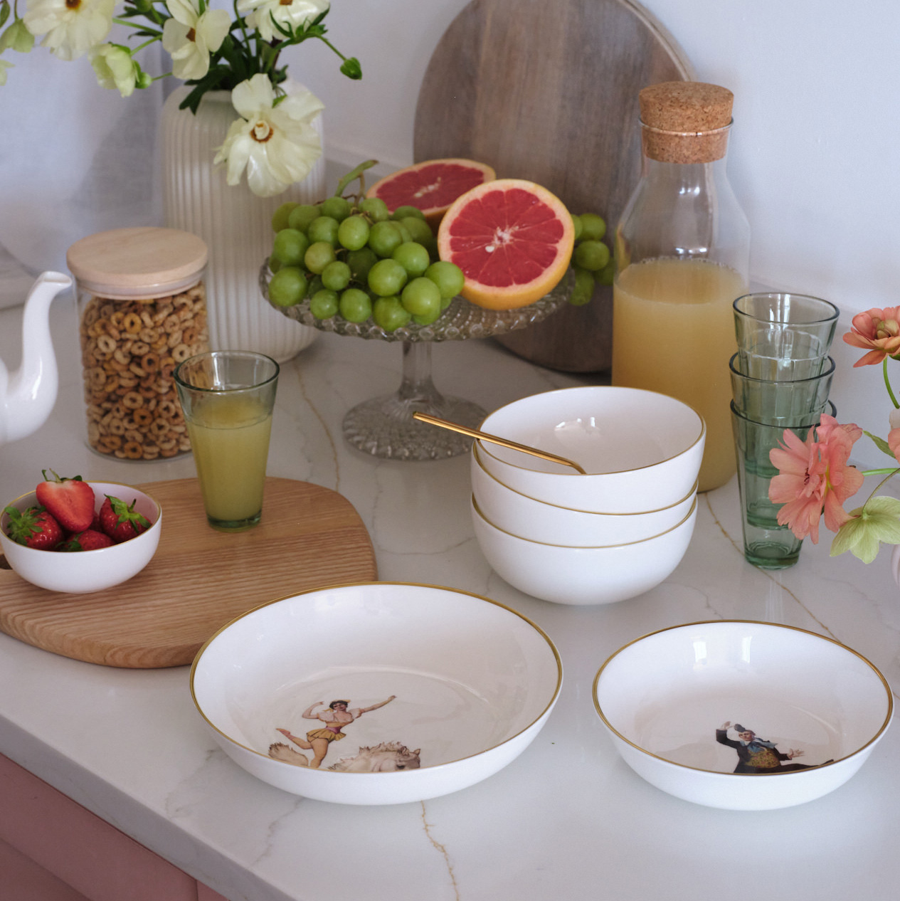 Introducing our NEW size cereal bowls, now available as a set of two exquisitely handcrafted fine bone china bowls featuring the circus inspired Trapeze Girl and Boy designs, edged in hand painted 22kt burnished gold.
