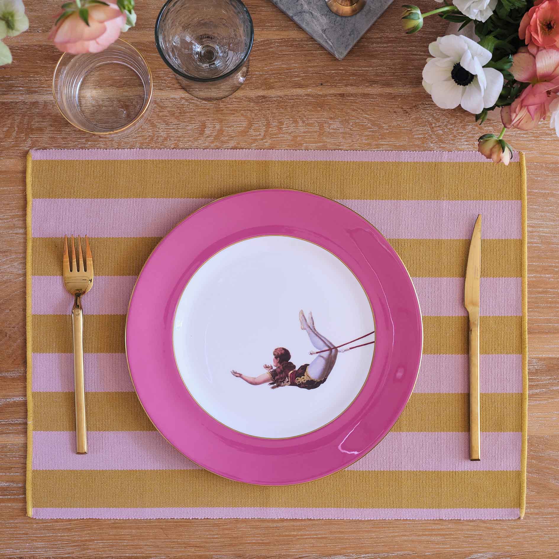 An exquisitely handcrafted fine bone china dinner plate featuring the circus inspired Trapeze Girl design with a bold and beautiful Raspberry Pink border, edged with hand painted 22kt burnished gold.
